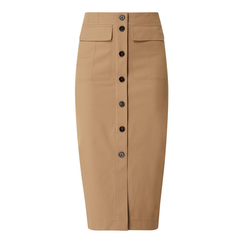 Spódnica midi damska Marc Cain Collections, Mieszanka bawełny i elastanu, Wąski krój, Listwa guzikowa, Ozdobne patki, Rozporek, Wszyty zamek błyskawiczny z tyłu, Długość całkowita w rozmiarze 36: 79 cm, Szerokość w pasie w rozmiarze 36: 72 cm