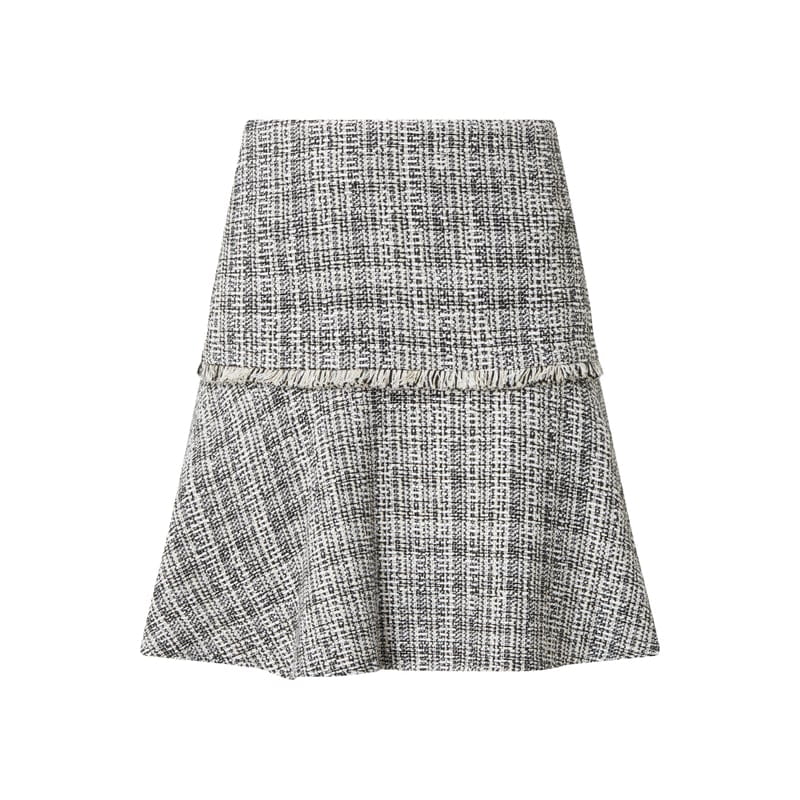 Spódnica mini damska HUGO, Mieszanka bawełny , Krój rozkloszowany, Tweed, Obszycie frędzlami , Zamek błyskawiczny na plecach , Lekka halka , Długość całkowita w rozmiarze 36: 44 cm, Szerokość w pasie w rozmiarze 36: 72 cm