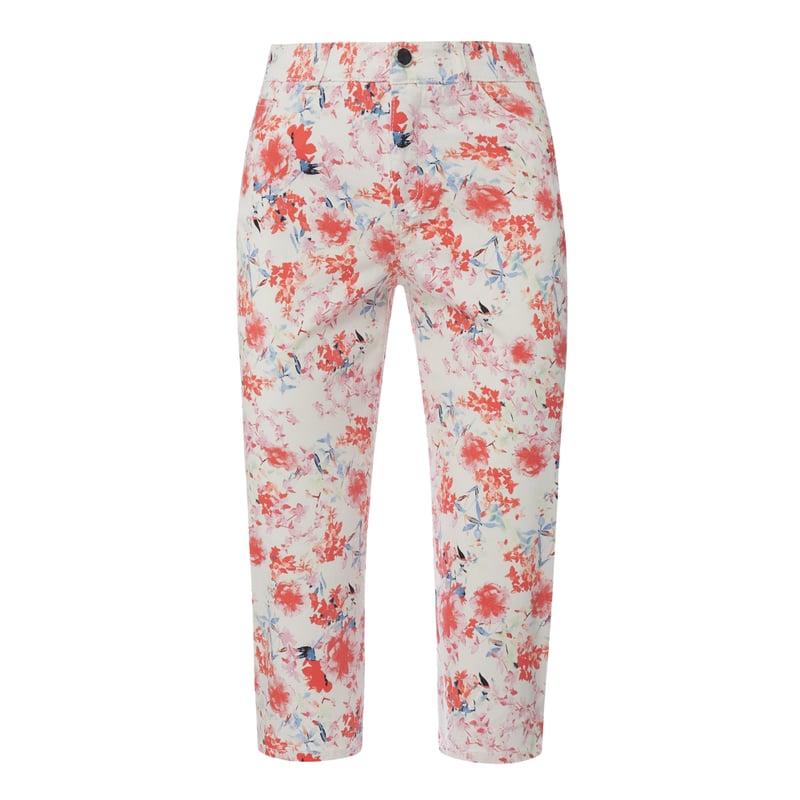 Spodnie capri Christian Berg Women, Mieszanka bawełny i elastanu , Zwężana nogawka , Długość 7/8 , Kwiatowy wzór , Zapięcie na guzik i zamek błyskawiczny , 5 kieszeni , Długość wewnętrzna nogawki w rozmiarze 36: 43 cm, Szerokość w pasie w rozmiarze 36: 74 cm