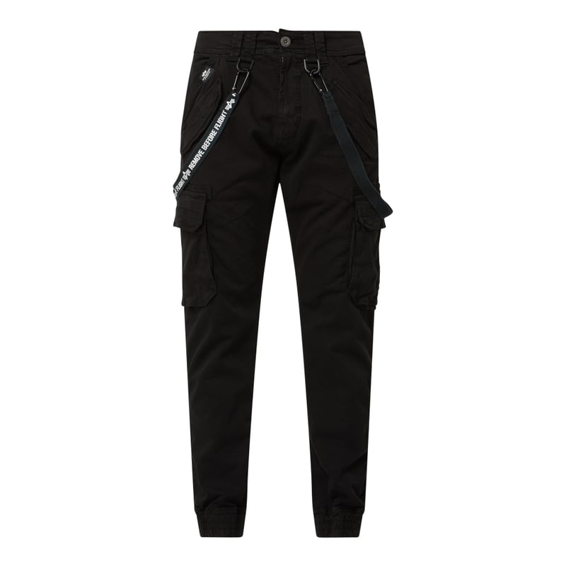 Spodnie cargo męskie Alpha Industries, Mieszanka bawełny i elastanu , Krój slim fit , Zapięcie na guzik i zamek błyskawiczny , Odpinane paski , Wpuszczane kieszenie , Ozdobne patki , Kieszenie cargo , Elastyczne zakończenia nogawek, Kieszenie z patką na zatrzask, Długość wewnętrzna nogawki w rozmiarze 32: 73 cm, Szerokość w pasie w rozmiarze 32: 86 cm