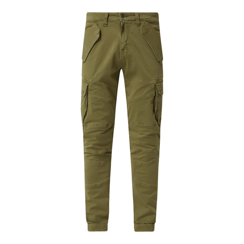 Spodnie cargo męskie Alpha Industries, Mieszanka bawełny i elastanu, Wąska nogawka, Zapięcie na guzik i zamek błyskawiczny , Wpuszczane kieszenie w stylu francuskim z ozdobnymi patkami , Kieszenie cargo, Kieszenie tylne z patką, Elastyczne zakończenia nogawek , Długość wewnętrzna nogawki w rozmiarze 32: 75 cm, Szerokość w pasie w rozmiarze 32: 82 cm
