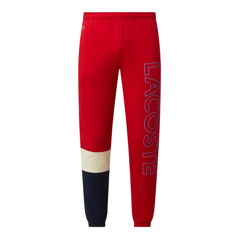 Spodnie dresowe męskie LACOSTE, Mieszanka bawełny, Luźny krój, Wielokolorowy design, Elastyczny pas z tunelem , Boczne wpuszczane kieszenie , Logo, Elastyczne zakończenia nogawek, Długość wewnętrzna nogawki w rozmiarze M: 74,5 cm