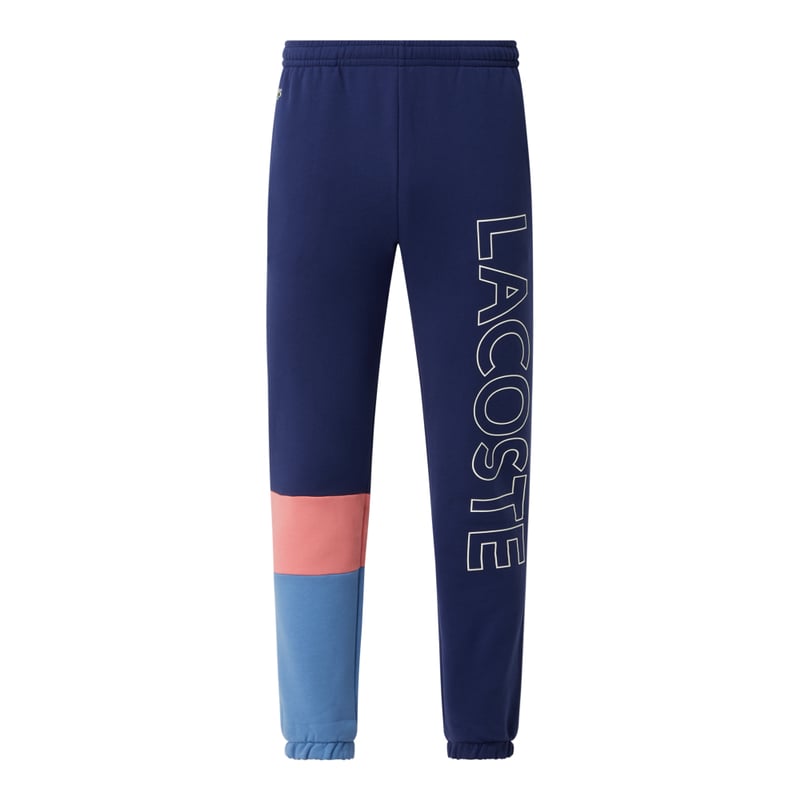 Spodnie dresowe męskie LACOSTE, Mieszanka bawełny, Luźny krój, Wielokolorowy design, Elastyczny pas z tunelem , Boczne wpuszczane kieszenie , Logo, Elastyczne zakończenia nogawek, Długość wewnętrzna nogawki w rozmiarze M: 74,5 cm