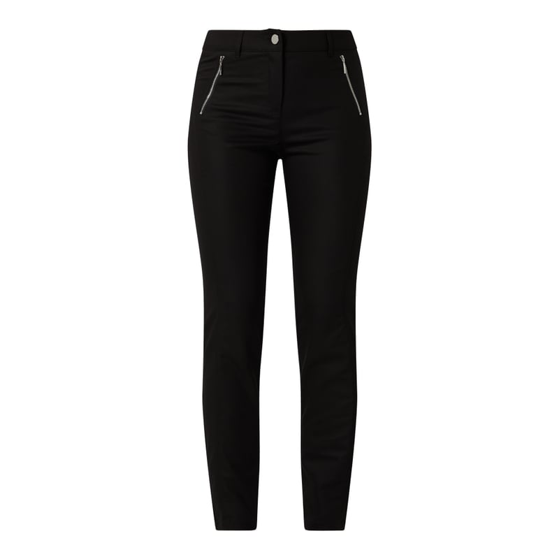 Spodnie materiałowe damskie comma, Mieszanka bawełny z dodatkiem streczu, Krój skinny fit , Zapięcie na guzik i zamek błyskawiczny , Kieszenie zapinane na zamek błyskawiczny , Kieszenie tylne z wypustką, Długość wewnętrzna nogawki w rozmiarze 36: 75 cm, Szerokość w pasie w rozmiarze 36: 72 cm