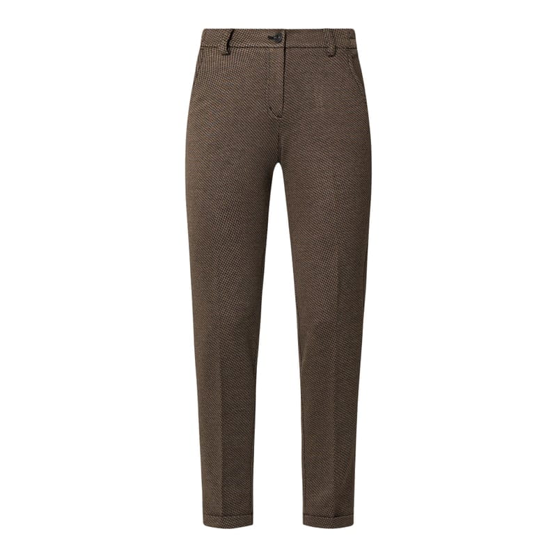 Spodnie materiałowe damskie OPUS , Mieszanka materiałów z dodatkiem wiskozy i streczu , Wąski krój , Delikatny tkany wzór , Elastyczna wstawka w pasie , Zapięcie na guzik i zamek błyskawiczny , Wpuszczane kieszenie w stylu francuskim , Kanty, Zakończenia nogawek z przyszytym brzegiem, Ozdobne wypustki z tyłu , Długość wewnętrzna nogawki w rozmiarze 36: 71 cm, Szerokość w pasie w rozmiarze 36: 68 cm