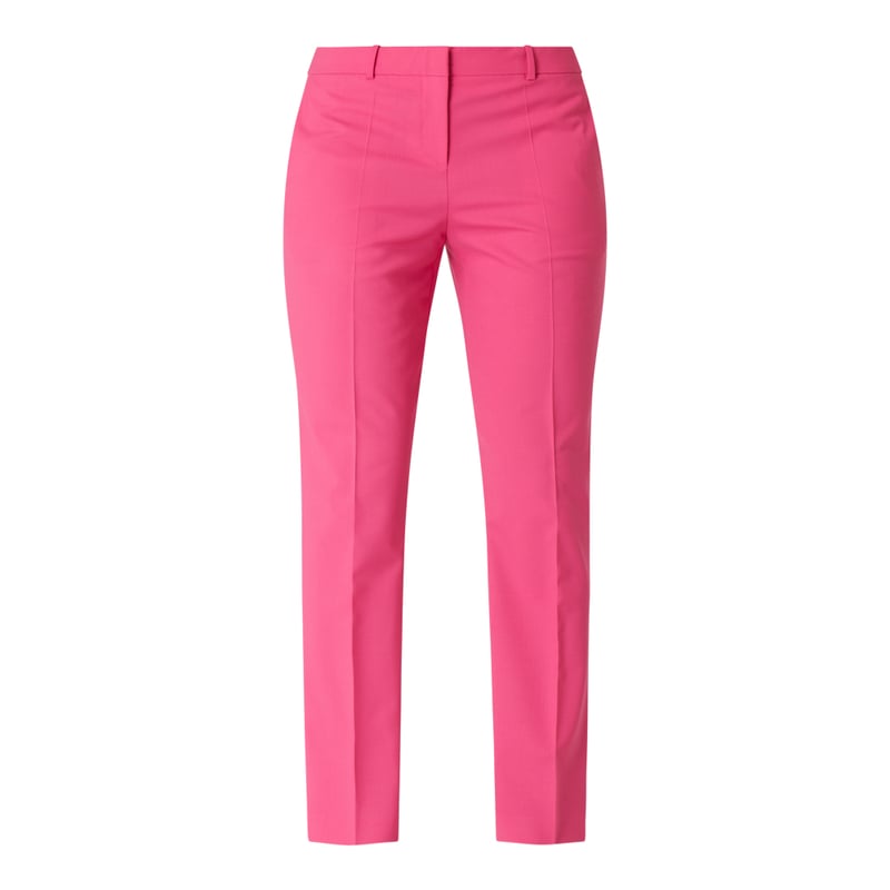 Spodnie materiałowe damskie BOSS , Mieszanka żywej wełny i elastanu , Wąski krój , Zapięcie na haftkę, guzik i zamek błyskawiczny , Wpuszczane kieszenie w stylu francuskim , Kanty , Ozdobna wypustka z tyłu , Długość wewnętrzna nogawki w rozmiarze 36: 75 cm , Szerokość w pasie w rozmiarze 36: 80 cm