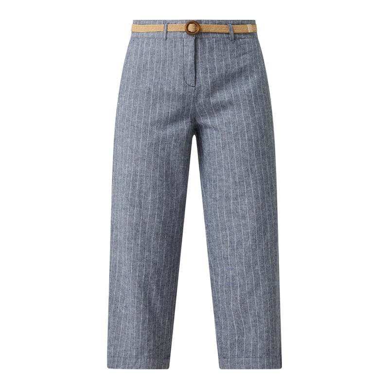 Spodnie damskie Christian Berg Women, Mieszanka lnu i bawełny, Szeroka, skrócona nogawka, Cienkie prążki, Zapięcie na 2 haftki, guzik i zamek błyskawiczny, Wpuszczane kieszenie w stylu francuskim, Kieszenie tylne z wypustką, Z paskiem z efektem plecionki, Długość wewnętrzna nogawki w rozmiarze 36: 60 cm, Szerokość w pasie w rozmiarze 36: 74 cm