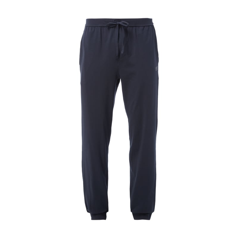 Spodnie od piżamy męskie BOSS, Mieszanka bawełny i elastanu, Luźny krój, Elastyczny pas z tunelem, Dwie wpuszczane kieszenie, Elastyczne zakończenia nogawek, Wyhaftowane logo, Długość wewnętrzna nogawki w rozmiarze L: 77,5 cm