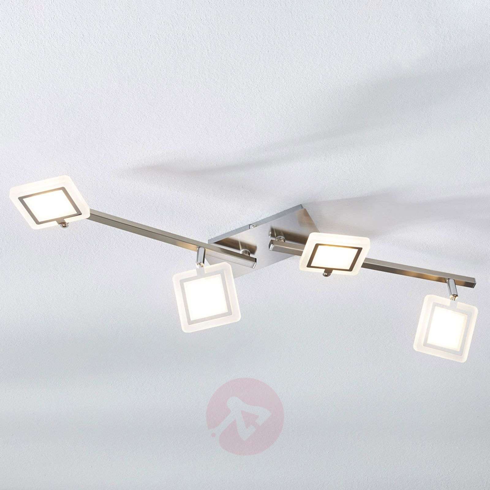 Metaliczny spot sufitowy LED Evelina z niklu Spot sufitowy LED Evelina zapewnia optymalne oświetlenie, a jego chromowana powierzchnia prezentuje błyszczące metaliczne odbicia światła. Jako mieszanka stylów, lampa sufitowa współgra z drewnem i kamieniem, ale może być również wykorzystana w gabinecie jako mocne źródło światła. Lampę sufitową LED można umieścić na suficie za pomocą okrągłej rozety. Przymocowana jest do niej krótka metalowa belka, która przechodzi w metalowy pręt. Na nim umieszczone są cztery reflektory. Dzięki dobremu oświetleniu, spot sufitowy LED Evelina doskonale sprawdzi się w obszarze hobbystycznym, na przykład podczas szycia lub obróbki drewna. Klasa efektywności energetycznej: A+