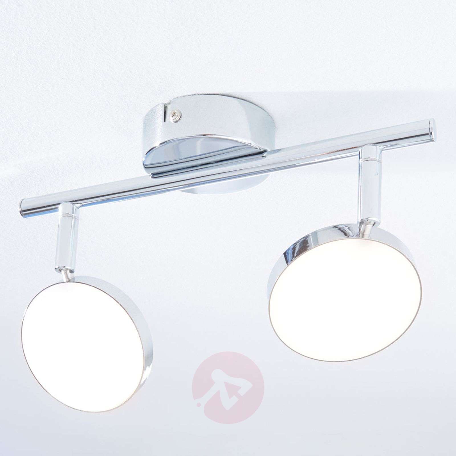 Spot sufitowy LED Keylan, błyszczący, chromowany 2-punktowy reflektor sufitowy LED Keylan zapewnia eleganckie i atrakcyjne oświetlenie wnętrza. Błyszcząca chromowana stylistyka sprawia, że lampa szczególnie przyciąga wzrok, a przy tym stanowi stylowe i eleganckie uzupełnienie każdego wnętrza. Dwa okrągłe elementy oświetleniowe tworzą jednolity obraz świetlny w pomieszczeniu. Obudowa, pręt i uchwyt, kombinacja elementów metalowych i plastikowych, doskonale wkomponowują się w całość i urzekają jednolitym połyskiem elementów chromowanych. Klasa efektywności energetycznej: A+