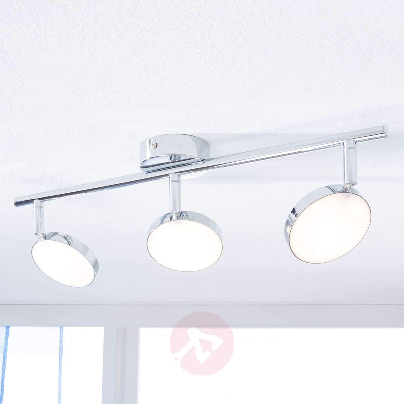 Chromowany błyszczący spot sufitowy LED Keylan Ten 3-punktowy reflektor sufitowy LED Keylan to prosty i pełen gracji model, który gustownie dopełnia oświetlenie wnętrza i urzeka swoim wyglądem, świadczącym o doskonałej jakości. Ta lampa sufitowa ma trzy okrągłe, płaskie klosze na wydłużonym pręcie, dzięki czemu światło dociera do wszystkich kątów w pomieszczeniu. Każda pojedyncza głowica świetlna może być obracana i odchylana w celu uzyskania optymalnego ustawienia światła. Błyszczące chromowane wykończenie eleganckiej lampy rozciąga się na wszystkie dobrze elementy o pięknym kształcie i zapewnia harmonijny wygląd całości designu i odpowiednie oświetlenie. Klasa efektywności energetycznej: A+