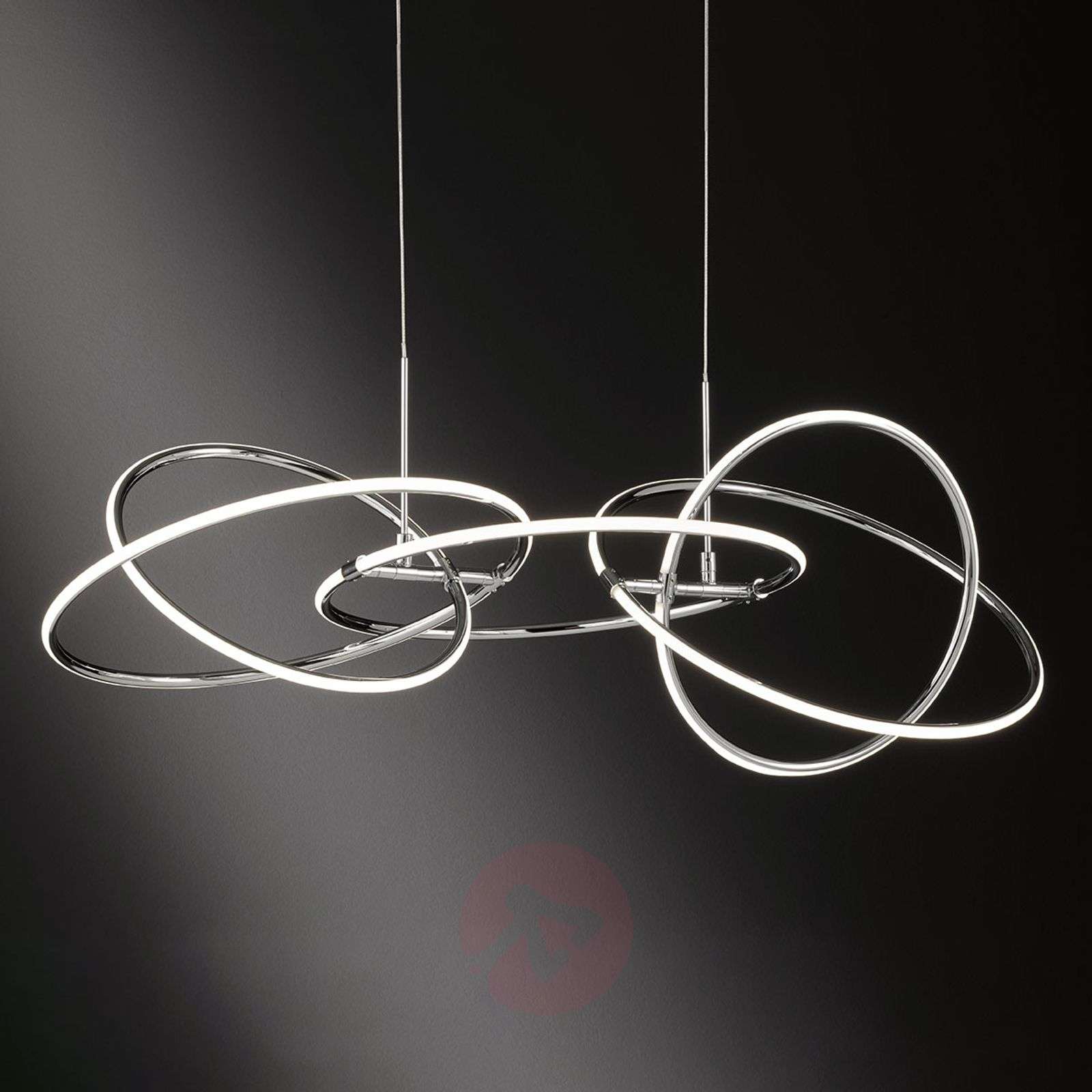 Ściemniana lampa wisząca LED Spring w unikalnym stylu Lampa wisząca LED Spring przyciąga wzrok i inspiruje. Wykonana z tworzywa sztucznego i aluminium oprawa świetlna składa się z filigranowego mocowania sufitowego i zawieszenia. Do niego zamocowanych jest pięć wzajemnie zapętlonych pierścieni ze zintegrowanymi diodami LED. Całość prezentuje się zjawiskowo przy włączonym świetle, które można ściemniać w trzech stopniach za pomocą przełącznika ściennego (50%, 75%, 100%). W ten sposób można dopasować oświetlenie do sytuacji, co jest szczególną zaletą w przypadku pomieszczenia pełniącego różne funkcje. Przy odpowiednio ustawionej jasności doskonale zatem sprawdzi się w czasie posiłku czy przyjemnego wieczoru przed telewizorem. Klasa efektywności energetycznej: A+