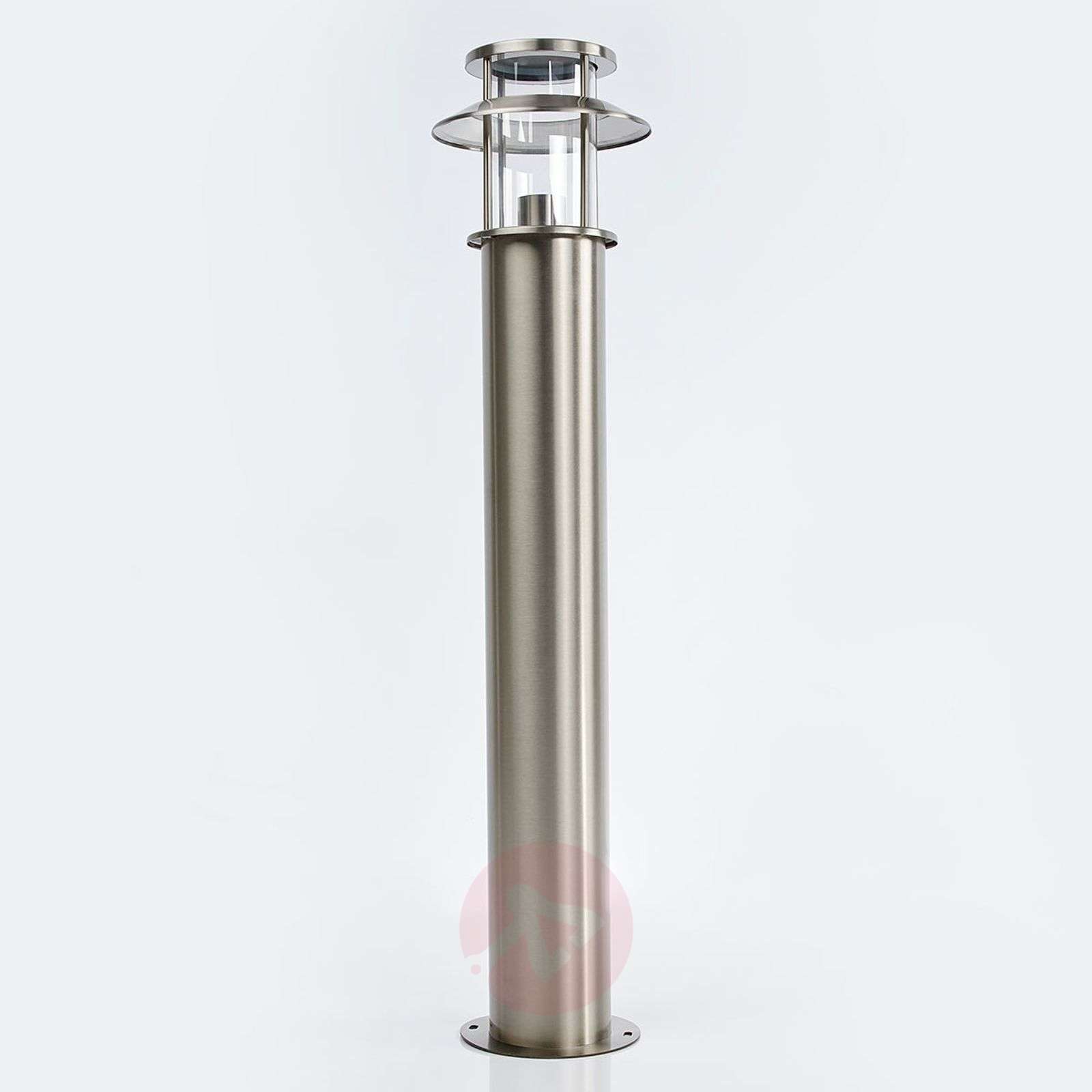 Nowocześnie wyglądający słupek oświetleniowy Ludovica z osłoną przypominająca daszek i przezroczystym plastikowym kloszem Dzięki stopniowi ochrony IP54 Ludovica idealnie nadaje się do stosowania na zewnątrz budynków, ponieważ zapewnia wystarczającą ochronę przed wodą i kurzem. Podstawa ze stali szlachetnej jest również odporna na warunki atmosferyczne i rdzę, a plastikowy klosz uchodzi za szczególnie wytrzymały i odporny na pęknięcia. Wszystko to sprawia, że powstaje słupek oświetleniowy do oświetlania ogrodu lub podwórka i że można się nim cieszyć przez długi czas. Klasa efektywności energetycznej: A++