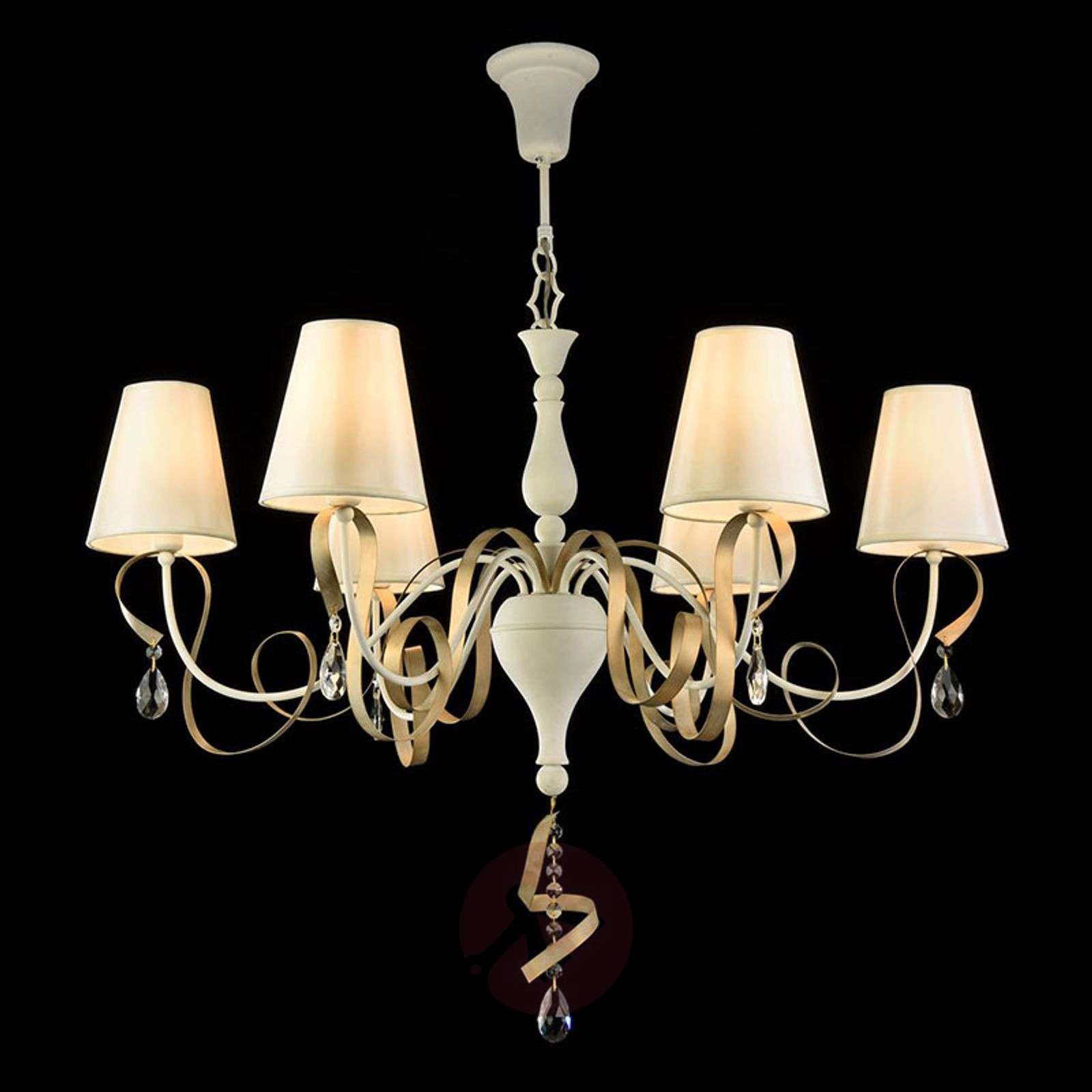 Elegancja spotyka się z nowoczesnością - 6-punktowy żyrandol Intreccio Żyrandol Intreccio nie tylko dzięki swojemu filigranowemu kształtowi, lecz również ze względu na stylową kolorystykę stanowi efektowny, centralny punkt, a równocześnie równie stylowy element wyposażenia wnętrza. Sześć śnieżnobiałych kloszy z tkaniny zapewnia łagodny rozkład światła oraz nieoślepiającą atmosferę świetlną. Szczególnie stylowo żyrandol prezentuje się dzięki swoim metalowym szarfom, które ze względu na swój złoty kolor i energiczny kształt znakomicie odróżniają się od śnieżnobiałej oprawy i nadają konstrukcji jeszcze bardziej luksusowy wygląd. Klasa efektywności energetycznej: A++