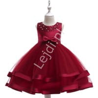 Sukienka dla dziewczynki na wesele zdobiona perełkami, ciemne wino