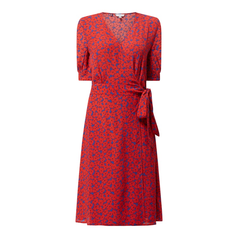 Sukienka kopertowa damska Tommy Hilfiger, Czysta wiskoza, Kwiatowy wzór, Taliowany krój, Dekolt w serek, Krótkie rękawy z zakończeniem zapinanym na guzik, Wiązanie z boku, Długość tyłu w rozmiarze 36: 104 cm