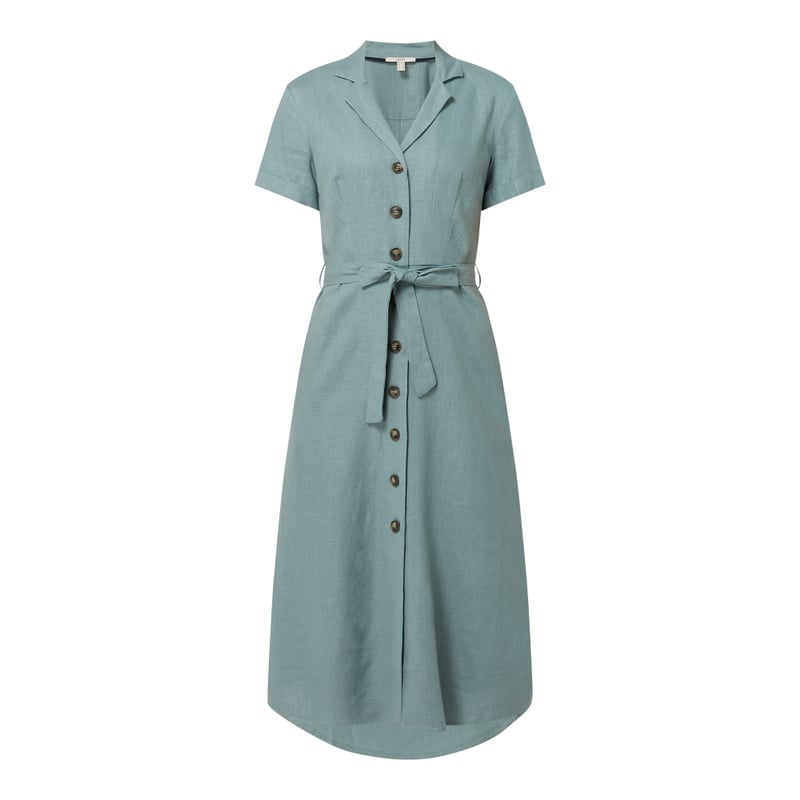 Sukienka koszulowa damska Esprit, Mieszanka lnu i wiskozy , Taliowany krój , Kołnierz z połami, Listwa guzikowa , Krótkie rękawy z przeszytą zakładką , Przeszyty pasek w talii do wiązania , Rozkloszowana spódnica , Wpuszczane kieszenie , Długość tyłu w rozmiarze 36: 117 cm