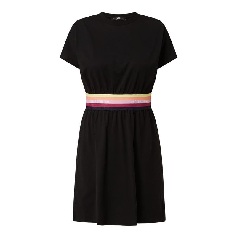 Sukienka koszulowa damska KARL LAGERFELD, Czysta bawełna , Taliowany krój , Okrągły dekolt , Krótkie rękawy , Elastyczna wstawka w kontrastowym kolorze w talii, Rozkloszowana spódnica , Drobne marszczenia, Detale z logo , Długość tyłu w rozmiarze S: 87 cm