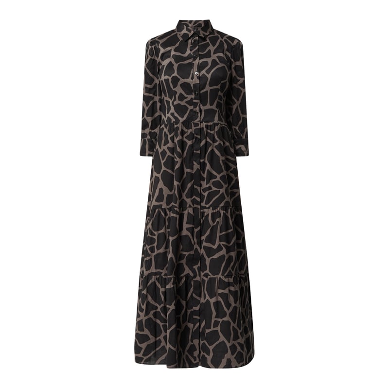 Sukienka koszulowa damska Marc Cain Collections, Mieszanka lnu z dodatkiem wiskozy i streczu, Taliowany krój , Zwierzęcy nadruk , Wykładany kołnierz, Listwa guzikowa , Rękaw o dł. 3/4, Mankiety zapinane na 2 guziki , Rozkloszowana spódnica ze szwami działowymi, Dół obszyty falbaną , Drobne marszczenia, Długość tyłu w rozmiarze 36: 140 cm