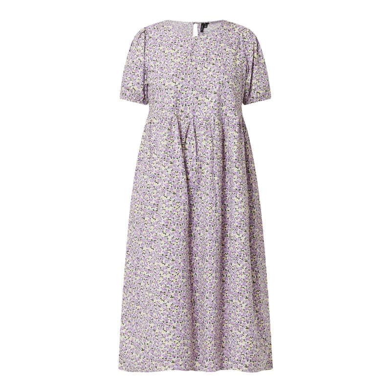 Sukienka midi damska VERO MODA, Czysta bawełna ekologiczna , Krój rozkloszowany , Kwiatowy wzór , Okrągły dekolt , Krótkie, bufiaste rękawy z elastycznym zakończeniem , Drobne marszczenia, Wycięcie w kształcie łezki zapinane na guzik z wiązaniami z tyłu , Długość tyłu w rozmiarze S: 107 cm