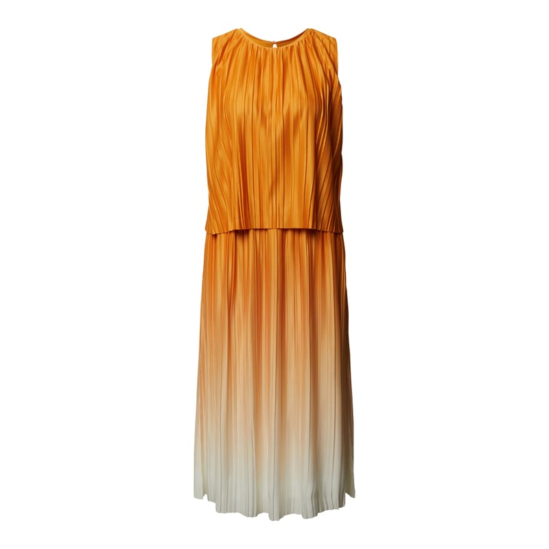 Sukienka midi damska BOSS, Wytrzymały materiał, Krój rozkloszowany, Model ‘Ezzica’, Cieniowanie, Okrągły dekolt, Efekt kilku warstw, Plisy, Halka, Bez rękawów, Wycięcie w kształcie łezki z tyłu, Długość tyłu w rozmiarze S: 119 cm, Szerokość klatki piersiowej w rozmiarze S: 36 cm, Długość rękawów: