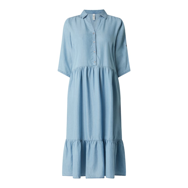 Sukienka midi damska soyaconcept, Czysty lyocell , Lekko taliowany krój , Tkanina stylizowana na denim , Wykładany kołnierz , Listwa guzikowa , Rękaw o dł. 3/4 , Regulowana długość rękawa , Odznaczająca się, rozkloszowana spódnica , Długość tyłu w rozmiarze S: 115 cm