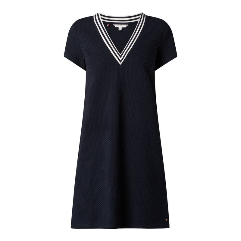 Sukienka mini damska Tommy Hilfiger, Mieszanka bawełny z dodatkiem streczu, Taliowany krój, Wzór z fakturą, Dekolt w serek w kontrastowym kolorze, Krótkie rękawy , Wpuszczane kieszenie, Długość tyłu w rozmiarze 36: 89 cm
