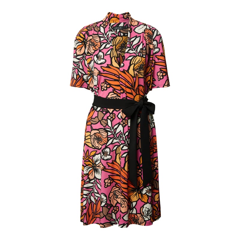Sukienka damska Marc Cain, Mieszanka materiałów z dodatkiem streczu, Zaznaczona talia, Kwiatowy wzór, Dekolt w serek, Tasiemka w talii, Krótkie rękawy, Długość tyłu w rozmiarze 36: 96 cm, Szerokość klatki piersiowej w rozmiarze 36: 47 cm , Długość rękawa w rozmiarze 36: 23 cm