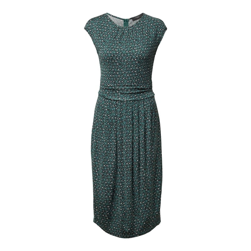 Sukienka damska Weekend Max Mara, Czysta wiskoza, Taliowany krój, Wzór na całej powierzchni, Okrągły dekolt, Drapowanie w talii, Spódnica z plisami, Zaokrąglony dół, Bez rękawów, Wszyty zamek błyskawiczny na plecach, Długość tyłu w rozmiarze S: 107 cm, Szerokość klatki piersiowej w rozmiarze S: 42, Długość rękawów: