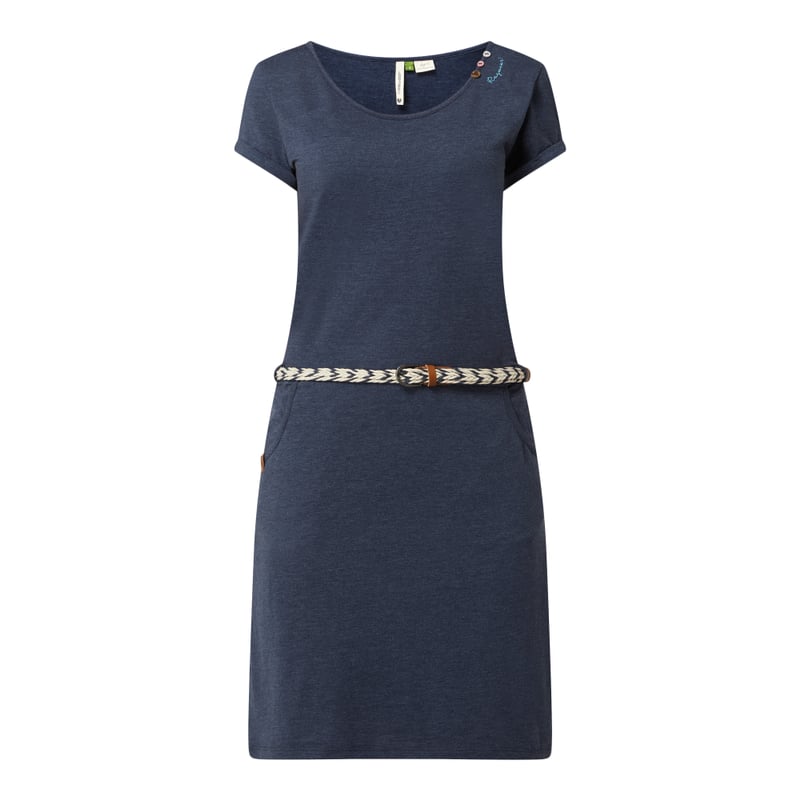 Sukienka damska Ragwear, Czysta bawełna ekologiczna , Dopasowany krój , Okrągły dekolt , Krótkie rękawy z przeszytym brzegiem , Przyszyty pasek w talii ze sprzączką , Wpuszczane kieszenie , Detale w kontrastowym kolorze, Nadruk z logo, Długość tyłu w rozmiarze S: 90 cm