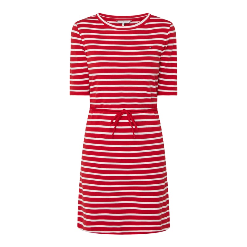 Sukienka damska Tommy Hilfiger, Czysta bawełna ekologiczna, Taliowany krój, Okrągły dekolt, Rękaw o dł. 1/2, Pasek wiązany w talii, Logo, Krótkie rozporki po bokach, Długość tyłu w rozmiarze S: 91 cm