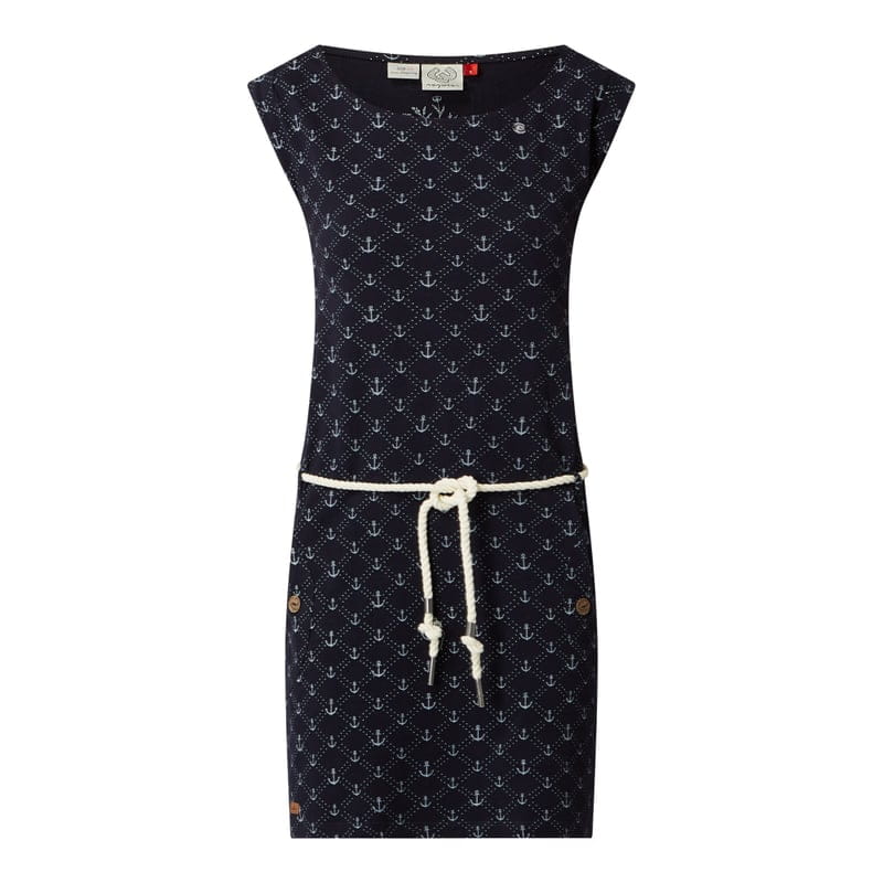 Sukienka damska Ragwear, Czysta bawełna, Krój rozkloszowany, Wzór na całej powierzchni, Okrągły dekolt, Krótkie rękawy z przeszytą zakładką, Taśma wiązana w talii, Boczne wpuszczane kieszenie z ozdobnym guzikiem, Logo, Długość tyłu w rozmiarze S: 84 cm