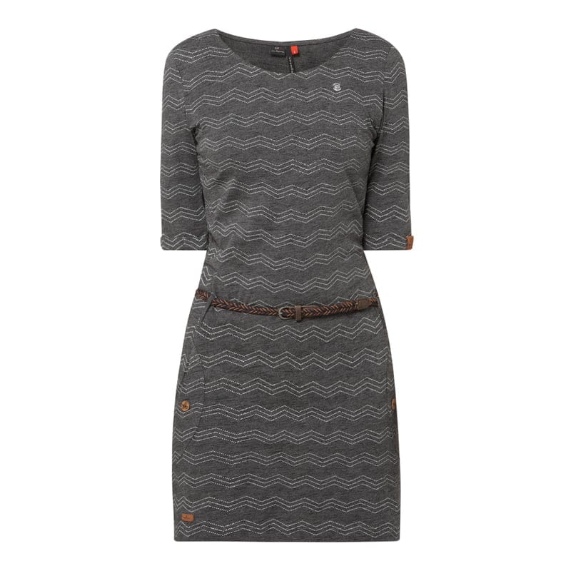 Sukienka z dżerseju damska Ragwear , Czysta bawełna , Dopasowany krój , Wzór w zygzaki, Okrągły dekolt , Rękawy o dł. 3/4 z przeszytą zakładką , Pasek pleciony ze sprzączką , Wpuszczane kieszenie z ozdobnymi guzikami , Aplikacje z logo , Wegańska , Długość tyłu w rozmiarze S: 85 cm