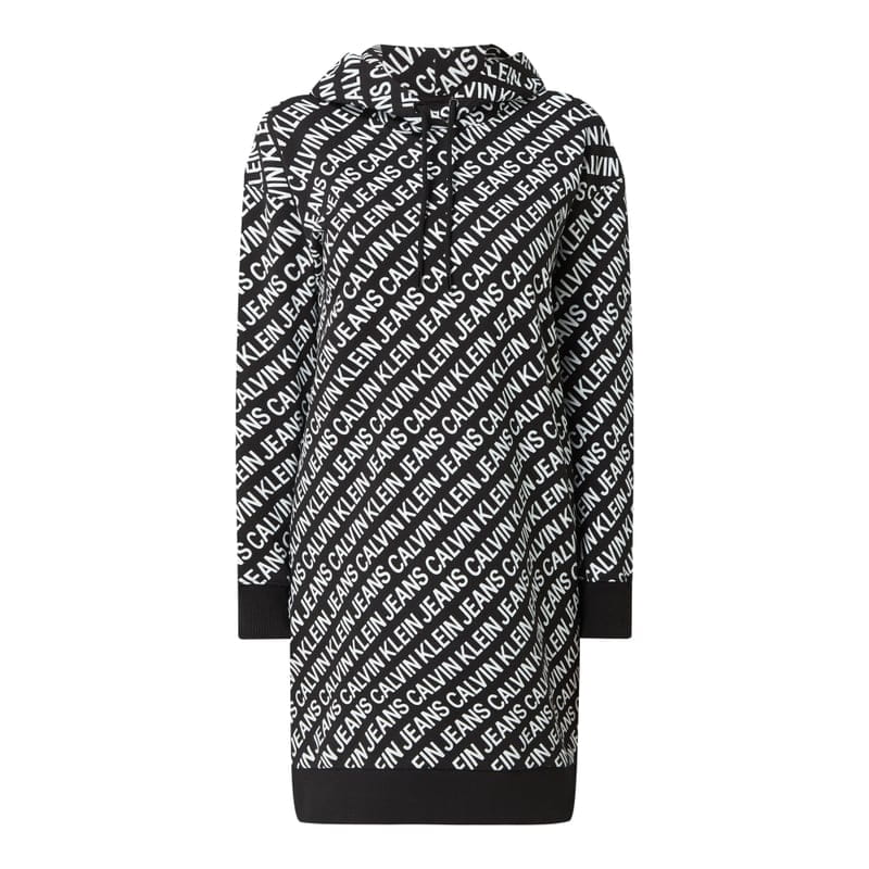 Sukienka z dzianiny dresowej damska Calvin Klein Jeans, Czysta bawełna ekologiczna , Lekko rozkloszowany krój , Wzór z logo , Kaptur z tunelem , Obniżone ramiona , Odznaczające się ściągacze , Długość tyłu w rozmiarze S: 87,5 cm