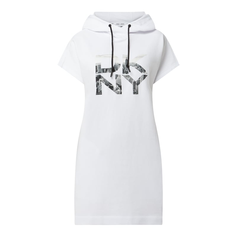 Sukienka z dzianiny dresowej damska DKNY PERFORMANCE , Czysta bawełna , Krój rozkloszowany , Kaptur , Krótkie, ukośnie skrojone rękawy , Logo , Wpuszczane kieszenie , Na dole prążkowana wstawka , Długość tyłu w rozmiarze S: 82 cm
