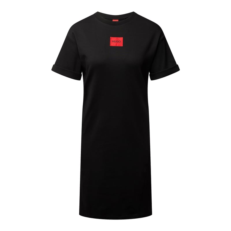 Sukienka z dzianiny dresowej damska HUGO , Wytrzymały materiał, Krój rozkloszowany , Okrągły dekolt , Obniżone ramiona , Krótkie rękawy z przeszytą zakładką, Naszywka z logo