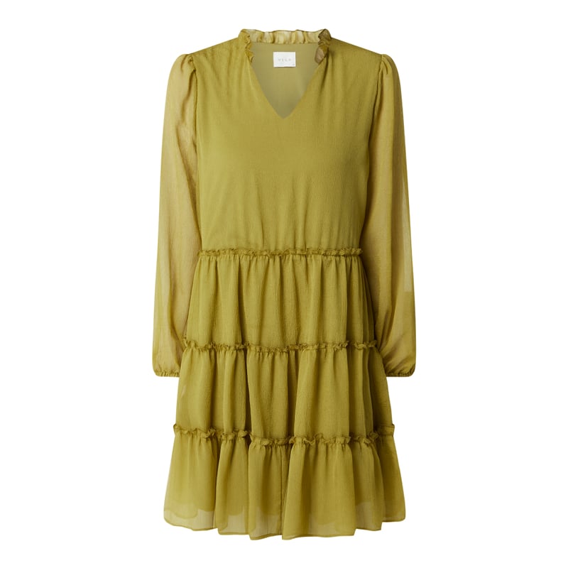 Sukienka damska VILA, Szyfon, Taliowany krój, Stopniowanie, Dekolt w serek, Długie rękawy z elastycznymi brzegami, Rozkloszowana spódnica, Długość tyłu w rozmiarze 36: 90 cm , Długość rękawa w rozmiarze 36: 61,5 cm