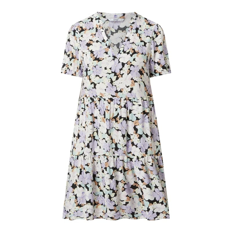 Sukienka damska ONLY , Czysta wiskoza , Krój rozkloszowany , Stopniowanie , Kwiatowy wzór , Dekolt w serek , Krótkie bufki , Długość tyłu w rozmiarze S: 92 cm