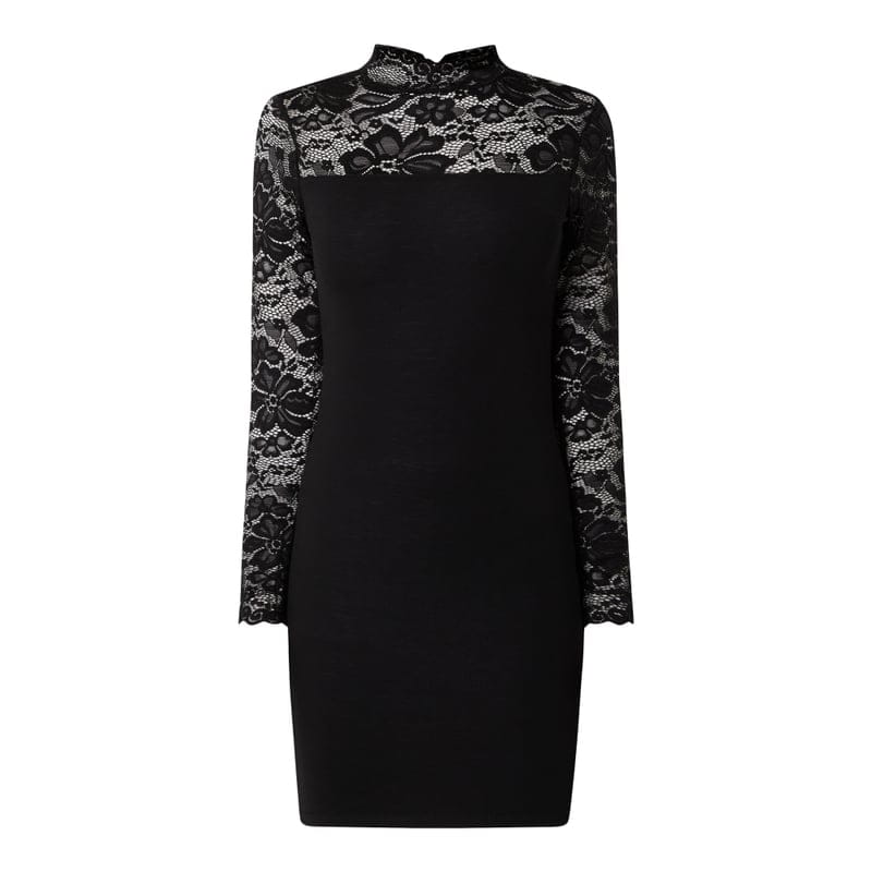 Sukienka damska VERO MODA , Mieszanka materiałów z dodatkiem wiskozy i streczu , Dopasowany krój , Stójka , Kwiatowa koronka , Wycięcie w kształcie łezki zapinane na guzik z tyłu , Długość tyłu w rozmiarze S: 86 cm, Długość rękawa w rozmiarze S: 65 cm
