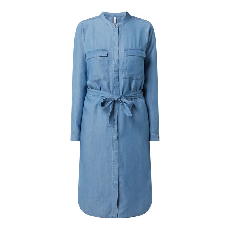 Sukienka damska soyaconcept , Czysty lyocell, Taliowany krój, Tkanina stylizowana na denim, Okrągły dekolt, Kryta listwa guzikowa, Kieszenie z patką na piersi, Taśma wiązana w talii, Mankiety zapinane na 1 guzik, Rozcięcia po bokach, Kontrafałda z tyłu, Długość tyłu w rozmiarze S: 109 cm, Długość rękawa w rozmiarze S: 61 cm