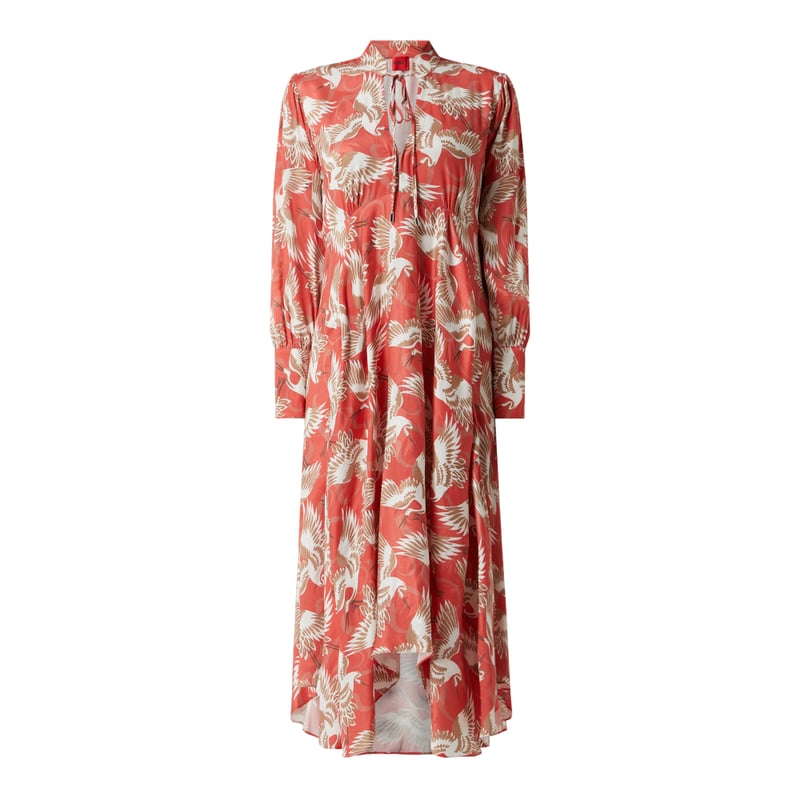 Sukienka damska HUGO, Mieszanka cupro i wiskozy, Krój regular fit , Wzór na całej powierzchni , Stójka z tasiemką do wiązania, Dekolt w serek , Boczne wpuszczane kieszenie , Długość tyłu w rozmiarze 36: 119 cm, Długość rękawa w rozmiarze 36: 63 cm