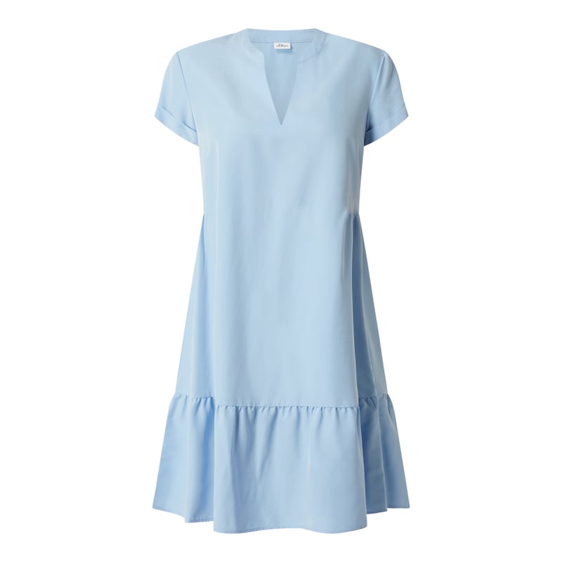 Sukienka damska s.Oliver BLACK LABEL, Modal mieszany , Krój rozkloszowany , Kołnierz z lamówką, Krótkie rękawy z przeszytą zakładką , Dół obszyty falbaną , Drobne marszczenia, Długość tyłu w rozmiarze 36: 102 cm