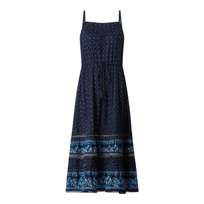 Sukienka damska Superdry, Czysta wiskoza , Krój rozkloszowany , Tkanina plumeti , Prostokątny dekolt , Cienkie ramiączka , Tunel z ozdobnymi chwostami , Dół obszyty falbaną z ozdobnymi tasiemkami i nitami , Długość tyłu w rozmiarze S: 115 cm