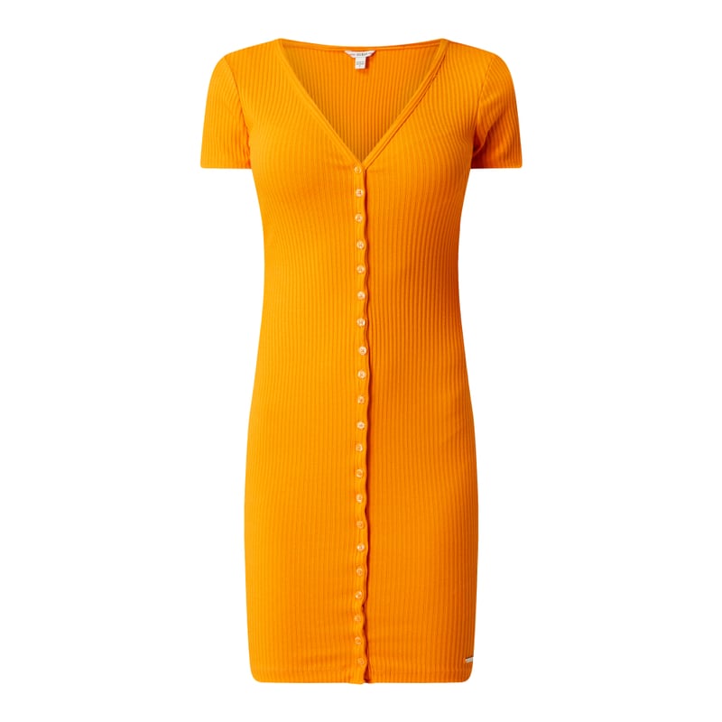Sukienka damska GUESS, Mieszanka materiałów z dodatkiem wiskozy i streczu , Dopasowany krój , Prążkowana faktura , Dekolt w serek , Listwa guzikowa z falistym dołem , Krótkie rękawy , Długość tyłu w rozmiarze S: 86 cm