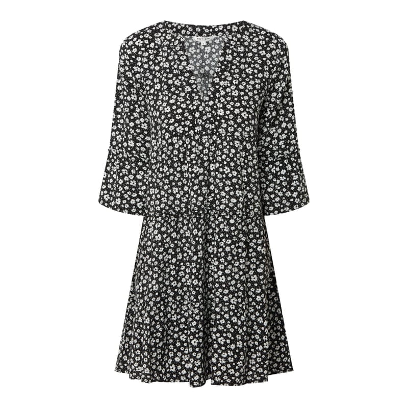 Sukienka damska REVIEW, Czysta wiskoza , Krój rozkloszowany , Kwiatowy wzór , Kołnierz z lamówką, Rękaw o dł. 3/4 , Dół obszyty falbaną , Drobne marszczenia, Długość tyłu w rozmiarze S: 89 cm