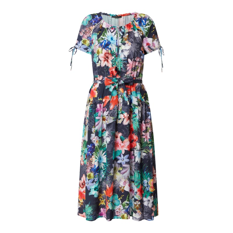 Sukienka damska Betty Barclay, Czysta wiskoza, Taliowany krój, Kwiatowy wzór, Okrągły dekolt , Wiązane wycięcie w kształcie łezki, Krótkie rękawy raglanowe , Gumka w talii, Pasek wiązany w talii, Rozkloszowana spódnica, Długość tyłu w rozmiarze 36: 116 cm
