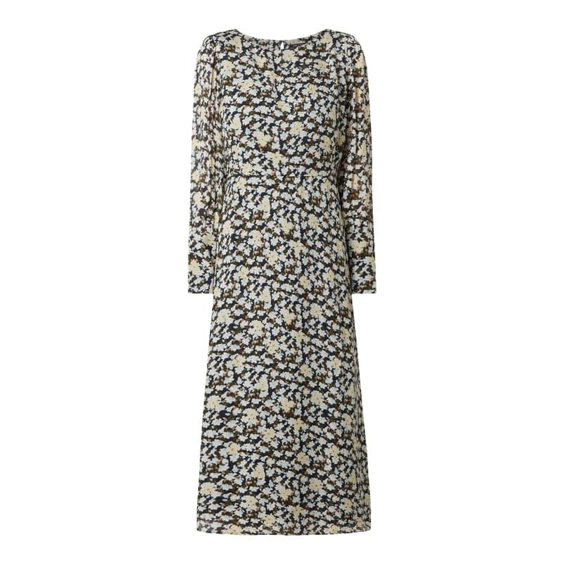 Sukienka damska MARC O’POLO, Czysta wiskoza , Taliowany krój , Kwiatowy wzór , Okrągły dekolt , Długie rękawy z wykończeniem z guzikami, Rozkloszowana spódnica , Wycięcie w kształcie łezki zapinane na guzik z tyłu, Nisko wszyte zapięcie na zamek błyskawiczny z tyłu , Długość tyłu w rozmiarze 36: 121 cm, Długość rękawa w rozmiarze 36: 59 cm