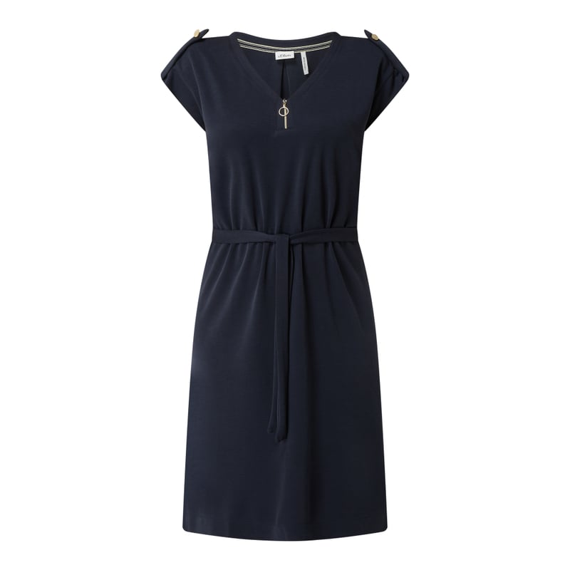 Sukienka damska s.Oliver BLACK LABEL, Modal mieszany , Taliowany krój , Dekolt w serek z krótkim zamkiem błyskawicznym w kolorze złota , Ukośnie skrojone rękawy z patką zapinaną na guzik , Tasiemka w talii , Lekko rozkloszowana spódnica , Długość tyłu w rozmiarze 36: 99 cm