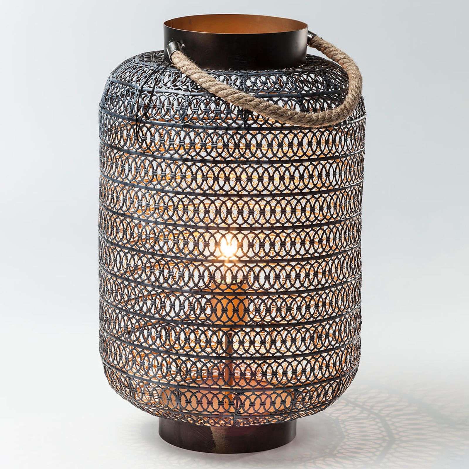 Lampa podłogowa Sultans Palace o orientalnym wyglądzie Sultans Palace to efektowna lampa podłogowa o designie przywodzącym na myśl Daleki Wschód. Obszerny korpus tej imponującej lampy wykonano z filigranowej stalowej plecionki. Po wyłączeniu światła Sultans Palace przypomina duży wazon, stanowiący przedmiot dekoracyjny w salonie. Gdy jednak światło jest załączone, lampa ujawnia swoje prawdziwe zalety, a mianowicie wywołuje wspaniały efekt świetlny, który powstaje dzięki stalowej plecionce przypominającej klatkę. Design Sultans Palace dopełniony jest przez uchwyt sizalowy, który sprawia, że lampa ta ma prawdziwy orientalny wygląd i umożliwia bezpieczne przenoszenie lampy. Klasa efektywności energetycznej: A++
