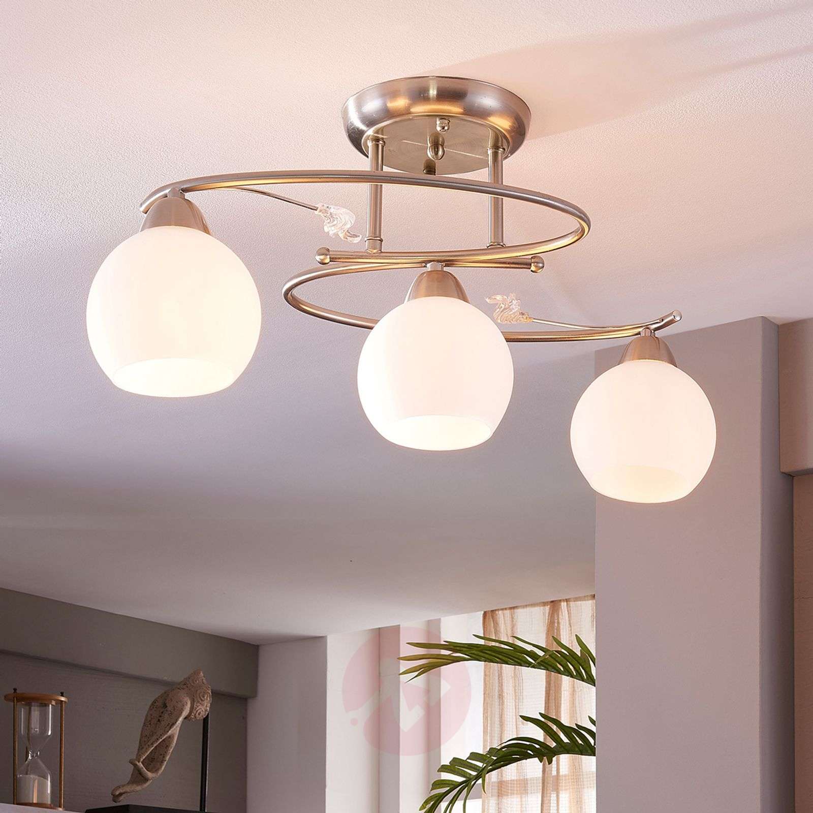 Trzypunktowa lampa sufitowa Svean z niklowaną oprawą Lampa sufitowa Svean składa się z lekką wygiętej oprawy o niklowym, matowym wykończeniu oraz umieszczonych na niej kloszy z białego opalowego szkła. Dzięki wygiętej formie odznacza się fantazyjnym designem z nowoczesnymi akcentami. Ze względu na piękne, przytulne światło, jakie emituje lampa Svean, stanowić będzie codzienne oświetlenie salonu, gdzie zapewni odpowiednio jasne światło. Klasa efektywności energetycznej: A++